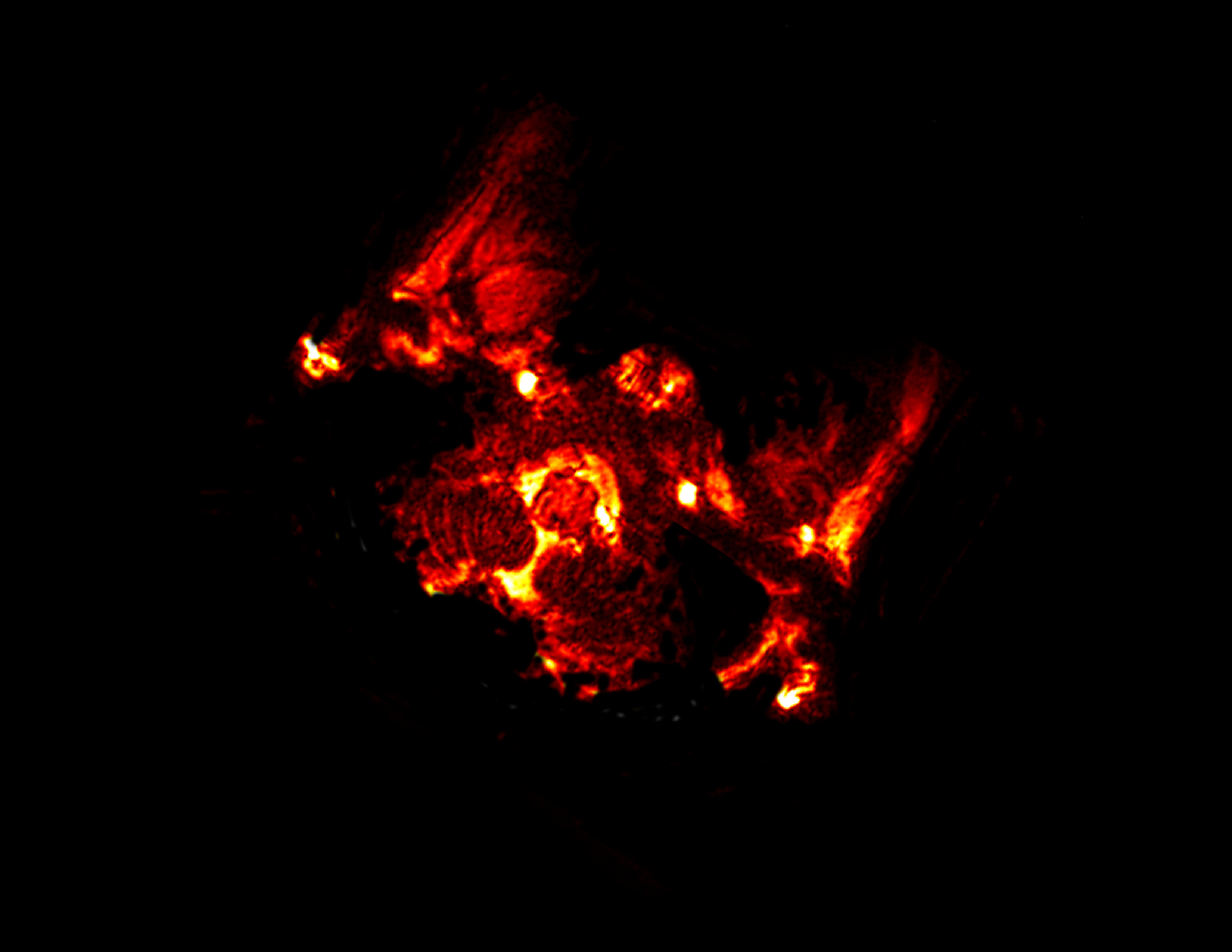 The brain is incredibly beautiful. This coronol-oblique slice captured the cerebellum, which you can see as the head of the firebird.