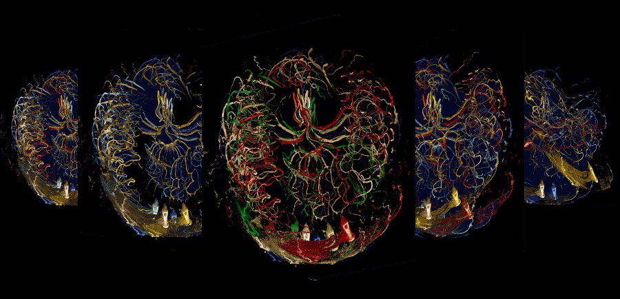 Each panel consists of 5 overlapping time of flight MR images of the same brain. The colours in front panel were intended to be reminiscent of the Italian flag.